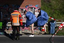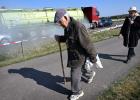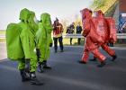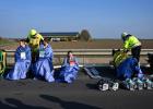 21-3-2026, Duitsland; Gangelt rampenoefening waarbij 3 landen, Nederland, Duitsland en Belgie, samenwerken 700 hulpverleners zijn actief bij een fictieve kettingbotsing. Acteurs (slachtoffers) moeten tijdens het lange wachten even naar de wc en trekken hun schoenen aan. (niet voor Trouw, Parool, AD en NRC)