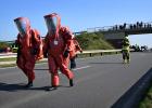 21-3-2026, Duitsland; Gangelt rampenoefening waarbij 3 landen, Nederland, Duitsland en Belgie, samenwerken 700 hulpverleners zijn actief bij een fictieve kettingbotsing. 2 Nederlandse brandweermannen van Chemelot (r) op weg naar een lekkende tankauto, passeren 2 Duitse brandweermannen. (niet voor Trouw, Parool, AD en NRC)
