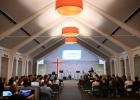 VRIJ 25-1-2026, Nederland; Gorinchem Godfluencer Noor van der Weijden (23) spreekt voor een groep jongeren bij de Evangelie Gemeente Sion. Het aantal gelovigen onder jongeren stijgt. Kaartjes liggen op de stoelen. (niet voor Trouw, Parool, AD en NRC)