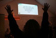 VRIJ 25-1-2026, Nederland; Gorinchem Godfluencer Noor van der Weijden (23) spreekt voor een groep jongeren bij de Evangelie Gemeente Sion. Het aantal gelovigen onder jongeren stijgt. Jonge gelovigen zingen in de zaal. (niet voor Trouw, Parool, AD en NRC)
