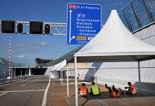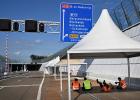 29-9-2025, Nederland, Rotterdam De nieuwe A16 en zijn Rottemerentunnel zijn officieel geopend. Maandag 6 oktober gaan er voor het eerst auto's over rijden. De tenten van de cateraar worden opgeruimd na de festiviteiten het voorbije weekend. De werknemers nemen een moment pauze. foto Marcel van den Bergh (niet voor Trouw, Parool, AD en NRC)