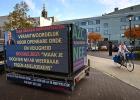 30-9-2025, Nederland, Amersfoort protest tegen komst AZC In het centrum staat een auto plus aanhanger met teksten tegen de komst van een AZC. foto Marcel van den Bergh (niet voor Trouw, Parool, AD en NRC)