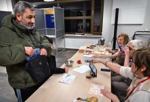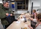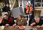 17-3-2026, Nederland, Oss Medewerkers van de gemeente zetten stemhokjes op bij diverse stemlocaties. Terwijl in Wijkcentrum Schadewijk wijkbewoners aan de wekelijks gratis lunch zitten, stoeien de stembureau-opbouwers met een stemhokje. (niet voor Trouw, Parool, AD en NRC)