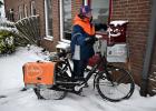 7-1-2026, Nederland, Puiflijk winter en veel sneeuw in Nederland De postbezorger van PostNl blijft haar werk doen op de fiets. foto Marcel van den Bergh (niet voor Trouw, Parool, AD en NRC)