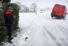 7-1-2026, Nederland, Bruchem winter en veel sneeuw in Nederland Een auto is geslipt en hangt op het randje van de sloot. De bestuurder gaat bellen over zijn situatie. foto Marcel van den Bergh (niet voor Trouw, Parool, AD en NRC)