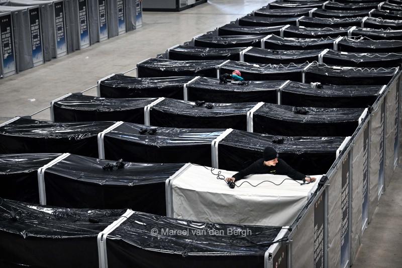 Een tijdelijke noodopvang voor 500 asielzoekers wordt opgebouwd in evenementenlocatie Breepark. Breda schiet hiermee opvanginstantie COA te hulp. Asielzoekers kunnen er voor een maand terecht. Boven de stapelbedden wordt de stroomvoorziening aangebracht.