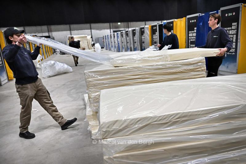 Matrassen worden binnengebracht.