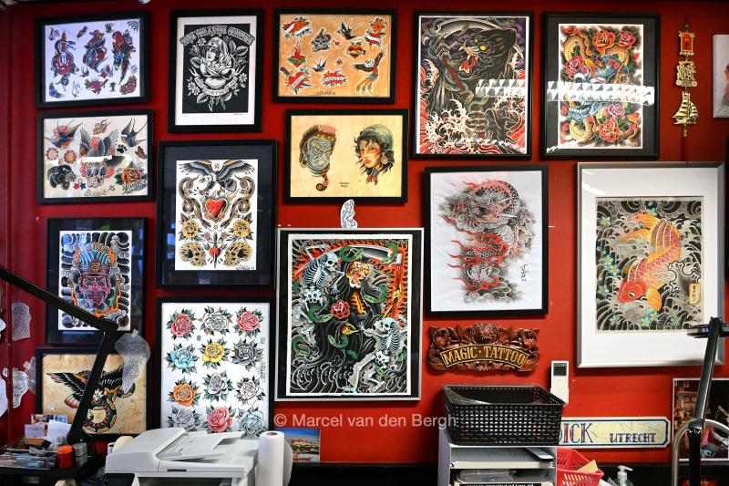24-1-2026, Nederland, Utrecht tattooshop Magic Tattoo tattoo-ontwerpen aan de muur (niet voor Trouw, Parool, AD en NRC)