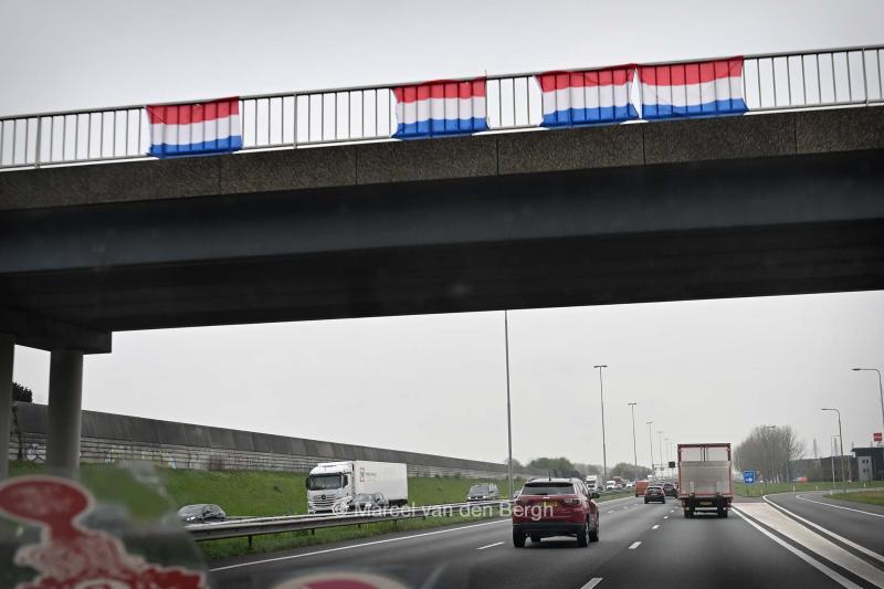 VRIJ 2-4-2026, Nederland, Waardenburg Nederlandse vlaggen hangen aan een viaduct boven de A2. (niet voor Trouw, Parool, AD en NRC)