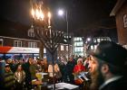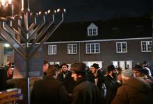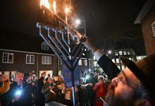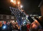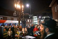 16-12-2025, Nederland, Den Bosch Joden vieren Chanoeka voor de oude synagoge. De rabbijn steekt de kaarsen aan. foto Marcel van den Bergh (niet voor Trouw, Parool, AD en NRC)