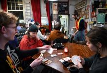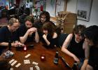 10-12-2025, Nederland, Nijmegen De Grote Broek is een ex-kraakpand dat kollectieven, aktivistengroepjes, een ontmoetingsplek en een sociaal centrum combineert in het centrum van Nijmegen. Een groepje bezoekers speelt een spelletje rummikub. foto Marcel van den Bergh (niet voor Trouw, Parool, AD en NRC)