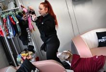 VRIJ 10-12-2025, Nederland, Oud-Beijerland Hondenfotograaf Kimberley van Motherpuppers Studio aan het werk. Ze doet haar eigen hond kleren aan voor een shoot. foto Marcel van den Bergh (niet voor Trouw, Parool, AD en NRC)