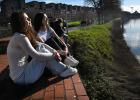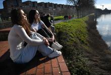 4-2-2026, Nederland, Maastricht voorjaarsweer en temperaturen in het zuiden Jongeren genieten van de zon aan de Maas. (niet voor Trouw, Parool, AD en NRC)
