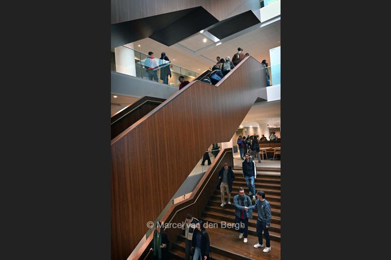 3-2-2026, Nederland, Den Haag De nieuwe universiteitscampus Spui in het oude V&D pand. Het trappenhuis. (niet voor Trouw, Parool, AD en NRC)