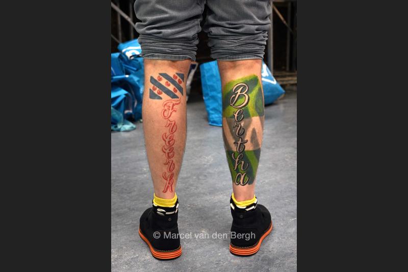 De namen van zijn ouders staan op zijn kuiten getatoueerd.