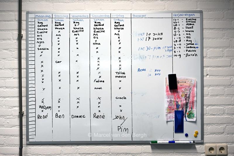 Aan de muur hangt het schema rooster van de vrijwilligers.