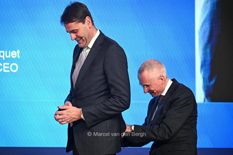 28-1-2026, Nederland, Eindhoven, Veldhoven ASML maakt jaarcijfers bekend. CEO Christophe Fouquet wordt geholpen met zijn zender door financieel directeur Roger Dassen. tijdens de persconferentie. (niet voor Trouw, Parool, AD en NRC)