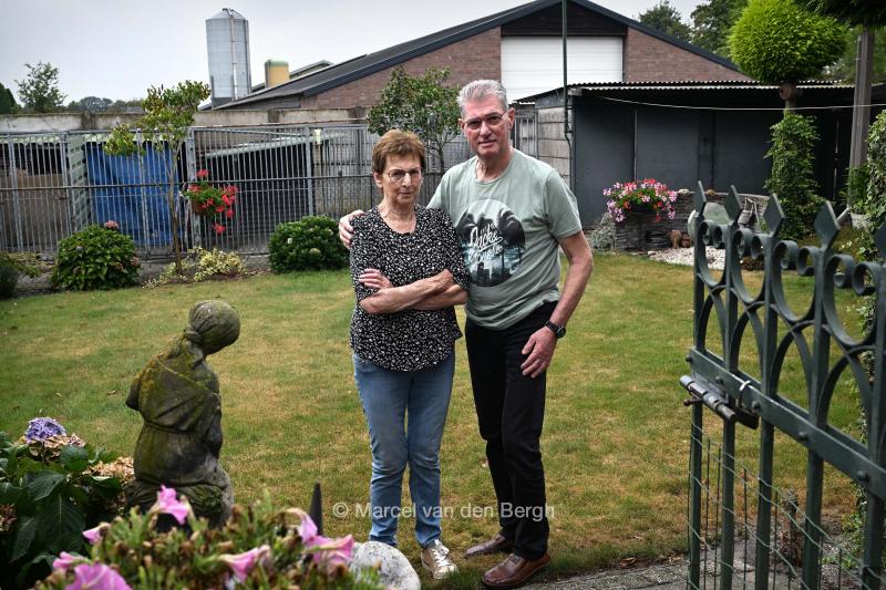 1-9-2025, Nederland, Wanroij echtpaar Minten poseert in hun tuin achter hun huis met in de achtergrond een varkenshouderij waarvan ze veel stankoverlast ervaren foto Marcel van den Bergh (niet voor Trouw, Parool, AD en NRC)