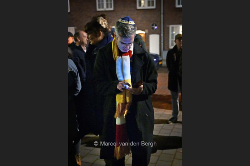 16-12-2025, Nederland, Den Bosch Joden vieren Chanoeka voor de oude synagoge. Joden verzamelen zich waaronder een man met de Oeteldonkse sjaal; foto Marcel van den Bergh (niet voor Trouw, Parool, AD en NRC)