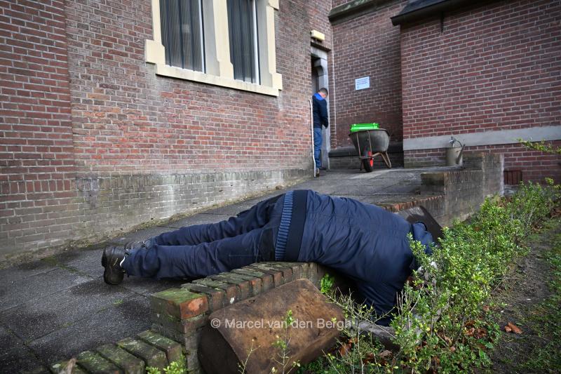 Een vrijwilliger bezig met het afsluiten van het water ivm de aankomende vorst.